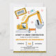 Zone de travail Camion en construction Invitation Anniversaire Tout âge en construction invitation d'anniversaire avec une grande pelle, des panneaux et un motif rayé jaune et noir. Cette invitation d'anniversaire en construction est idéale pour un premier anniversaire de garçon.