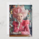 Un portrait époustouflant d'une élégante femme âgée avec une coiffure rose flamboyante et une tenue assortie, dégageant confiance et charme. Son maquillage vibrant et ses accessoires détaillés, dont les broches en forme de coeur, évoquent des thèmes d'amour et de passion. Avec un subtil chiqueteur de lèvres, elle semble souffler un délicat baiser, ajoutant une touche de romantisme à l'arrière - plan cosy du café.