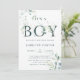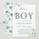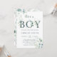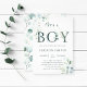 C'est une invitation de baby shower garçon qui comporte des feuilles d'eucalyptus peintes à l'aquarelle et des feuilles vertes avec des lettres botaniques vertes. Pour une personnalisation plus avancée de ce design, veuillez cliquer sur le lien Personnaliser davantage pour modifier la police, la taille et la couleur.
