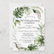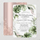 Un design moderne, chic et glamour avec des gouttes de paillettes sur fond rose gold et des feuilles tropicales.