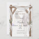 Une élégante invitation de mariage avec une arche en bois rustique, des rideaux blancs et un en-tête "Bismillah".