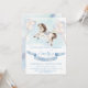 Invitation à l'anniversaire sur le thème du cheval avec l'illustration d'un charmant cheval de bébé et d'étoiles de conte de fées Watercolor en or avec ballons de couleurs pastel et ruban bleu pour la célébration!