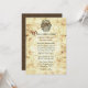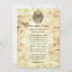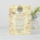 Faire-part de mariage de conte de fées vieilli fait dans un papier comme antique, avec fleuris sur les côtés gauche et droit. Des graphiques d'une crête avec des licornes décorent le sommet de l'invitation. L'arrière de l'invitation est fait dans un motif marron damassé. Personnalisez les champs de texte en fonction de vos besoins. La carte RSVP correspondante est disponible.