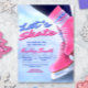 Faites de l'anniversaire hivernal de votre enfant un moment inoubliable avec cette invitation unique pour le patinage sur glace. La conception de l'invitation est mise en valeur par une illustration numérique de chaussures et de pantalons de patinage à glace tendance avec des arbres enneigés et des montagnes en arrière-plan.