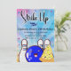 Invitation amusante "Faisons la fête", thème de couleur bleue, invitation pour garçon. Cette invitation est sur un fond frappant de teinture tie-dye (bleu). Elle utilise un thème rétro vif et coloré avec une palette de couleurs tendance. Les personnages de dessin animé kawaii de quilles de bowling accentuent l'amusement !