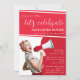 Invitation de fête de fin d'études rouge moderne et audacieuse avec une pin-up tenant un mégaphone.
