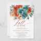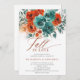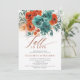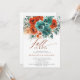 Cet automne en amour Turquoise Burnt Orange Botanical Floral Mariage ou Bridal Shower Invitation capture l'essence de l'automne avec une bordure botanique florale avec aquarelle rose et mariage feuillage dans les tons riches et chauds de turquoise et terre cuite brûlé orange, ainsi que le titre "Fall in Love" dans la calligraphie moderne. Le design accueillant est complété par une texture aquarelle pâle, évoquant l'air croustillant et les teintes dorées de la chute. Idéal pour une mariée qui planifie une douche nuptiale rustique ou un jardin intimiste, cette invitation reflète parfaitement l'atmosphère cosy et romantique de la saison d'automne, mêlant art romantique et élégante simplicité pour tout lieu.