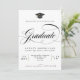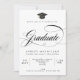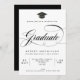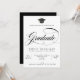 Une invitation à la graduation élégante et sophistiquée, avec une casquette noire avec des tasselles en faux or, et "diplômé" en caractères de calligraphie en script noir, sur un arrière - plan blanc. L'inverse est en noir solide.