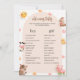 Cette adorable carte de jeu de baby shower présente un charmant thème animal de ferme avec de jolies illustrations d'une vache, lapin, poussin, cheval et cochon, entouré de fleurs joyeuses et d'un soleil souriant. Les couleurs pastel douces et le design fantaisiste créent une atmosphère chaleureuse et accueillante. Visitez notre boutique pour voir toute notre collection Brown d'animaux de ferme mignons.