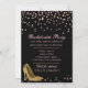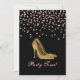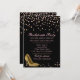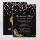 Invitation de fête de bachelorette glamour réalisée en noir, avec des graphiques de confettis rose et or et des talons hauts stiletto dorés. Personnalisez le texte personnalisé rose en fonction de vos besoins.