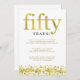 Cette invitation de fête élégante pour un cinquantième anniversaire de mariage dit "cinquante" en texte de faux or, et a une bordure de confettis de faux or en bas.