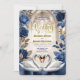 Transport your guests to a realm of majestic romance with this Gothic cathedral design. Featuring royal swans and deep indigo roses for a fairytale union.This design captures the essence of a high-fantasy romance set within the vaulted arches of a grand stone cathedral. The artwork features two majestic white swans meeting on a deep blue water surface to form a subtle heart shape, framed by a tiered stone fountain and a grand staircase. The color palette is dominated by deep navy and indigo floral borders, contrasted against creamy, off-white marble textures and faux bronze foliage. Typography pairs an intricate Gothic Blackletter font for names with an elegant gold-tone calligraphy script for details. This is a flat printed image with a faux gold foil and marble effect, not actual raised metal or stone material.