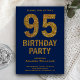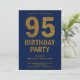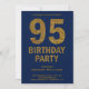 Éblouissez vos invités avec cette séduisante invitation de fête du 95e anniversaire avec un texte en parties scintillant dorée et audacieux contre un arrière - plan bleu. Ajoutez simplement les détails de votre événement sur ce modèle facile à utiliser pour en faire une invitation unique. Retournez la carte pour révéler une fausse texture de parties scintillant d'or au dos de la carte.