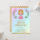 Impressionnez vos invités avec cette invitation à thème princesse aqiqah avec une adorable petite princesse et jolie couronne rose fleurie avec typographie moderne sur un arrière - plan pastel dégradé arc-en-ciel. Ajoutez simplement les détails de votre événement sur ce modèle facile à utiliser pour en faire une invitation unique. Retournez la carte pour révéler un faux motif de bandes de parties scintillant d'or au dos de la carte.