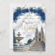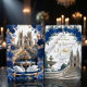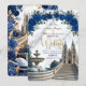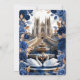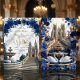 Définissez le ton pour une célébration majestueuse. Ce design présente une scène de cathédrale romantique avec des fleurs de couleur bleu royal et des accents en faux or, parfaite pour des unions de contes de fées.