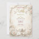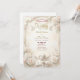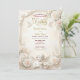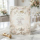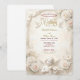 Annoncez votre union sacrée avec la grandeur intemporelle de la Renaissance. Ce design présente une esthétique céleste et des florales luxuriantes pour un ton véritablement romantique. Une composition visuelle complexe inspirée de l'architecture européenne classique. Le design met en valeur un effet de relief sculptural faux, simulant l'aspect de la pierre sculptée et des moulures architecturales dans des tons de champagne et de beige doux. Un vignette centrale présente une délicate illustration d'un chérubin jouant du violon, accompagné de colombes blanches en vol et de grappes luxuriantes de roses crème et rose. Le fond imite une surface de marbre texturé, tandis que la typographie simule le brillant de la feuille d'or. Il s'agit d'une image imprimée plate avec un effet de pierre et d'or, et non d'un matériau en relief réel, d'un gaufrage ou d'une