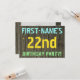 Ce design amusant d’invitation à la fête d’anniversaire comporte un message comme "FIRST-NAME’S 22nd BIRTHDAY PARTY!", où le nom peut être personnalisé, sur le devant. L'arrière - plan présente un motif rustique, brun, imitation bois de grain. Le texte de message personnalisable à l'avant présente des couleurs comme le bleu, le jaune et le vert, et il a un aspect inspiré de celui du lettrage peint et stencé. Le verso comporte un message personnalisé qui pourrait inclure des détails pertinents sur la fête d'anniversaire, comme le moment et l'endroit où elle a lieu, ainsi que toute autre information importante. Des invitations à des fêtes d'anniversaire comme celle-ci pourraient être une façon amusante pour la famille et les amis invitations d'une fête d'anniversaire organisée pour quelqu'un qui célèbre son vingt-deuxième anniversaire. [~Z0000291]