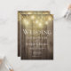 Invitation rustique de style champêtre avec la lumière chaude des lumières de fées et des jarres de maçon sur le bois naturel. Parfait pour les mariages campagnards, les soirées de jardin, les bbqs, les anniversaires d'automne ou les célébrations solstices d'été. Tous les styles, tailles et couleurs de police peuvent être customisés dans cette conception. Veuillez noter qu'aucune feuille réelle n'est utilisée dans cette conception.
