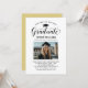 Elégante carte de faire-part de graduation et l'invitation de la fête de graduation félicite et annonce votre grade dans le style! Comprend un casquette noir, un "Graduate" en script, et un texte personnalisé moderne qui peut être personnalisé avec le nom du diplômé, l'école, et les détails de la fête. Ajoutez une photo préférée du grad. Notez que la couleur dorée du champagne au dos de la carte peut être changée en blanc ou en une autre couleur qui correspond aux couleurs de la photo ou de la fête.