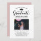 Elégante carte de faire-part de graduation et l'invitation de la fête de graduation félicite et annonce votre grade dans le style! Comprend un casquette noir, un "Graduate" en script, et un texte personnalisé moderne qui peut être personnalisé avec le nom du diplômé, l'école, et les détails de la fête. Ajoutez une photo préférée du grad. Notez que la couleur d'accent rose rose clair et poussiéreux au dos de la carte peut être changée en blanc ou en une autre couleur qui correspond aux couleurs de la photo ou de la fête.