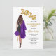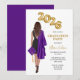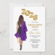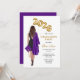 African American woman 2026 Graduation Party Invitation. Graduation Party Invitation female portrait drawing black dress, purple cap and gown, long dark hair. Class of 2026 gold balloons.