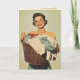 Illustration joyeuse et vintage d'une femme tenant une corbeille remplie de vêtements. Son sourire radieux, son maquillage brillant et ses cheveux bien stylisés évoquent l'esthétique de la publicité du milieu du 20e siècle, souvent associée à la félicité domestique et à l'artisanat.