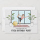 Organisez une fête d'anniversaire sur le thème du yoga à l'aide de ce design de Destei représentant une femme faisant la pose du danseur / Natarajasana. La femme est debout sur une jambe tandis que son autre jambe se tend vers le haut et se connecte avec l'une de ses mains. L'autre main de la femme est tendue vers l'avant tandis qu'elle se maintient en équilibre. La femme porte un débardeur couleur rose et des leggings de type capri gris foncé qui exposent ses mollets et ses orteils. Les cheveux bruns de la femme sont attachés en chignon à l'arrière de sa tête avec un élastique à cheveux marron. La femme est placée dans une pièce moderne avec trois grandes fenêtres et de grandes plantes feuillues vertes. La femme se tient debout sur un tapis de yoga couleur rose pâle. Il y a aussi un ballon de sport jaune rond à côté de la femme. La couleur de fond est gris