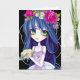 Carte de proposition de fête de mariée mignonne inspirée de anime, avec des dessins animés d'une femme de ménage aux cheveux bleus, aux yeux grands, contre un arrière - plan noir. Serez-vous ma demoiselle d'honneur ou ma carte d'honneur prête à être personnalisée pour chacun de vos amis.