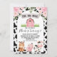 Floral Farm with Cow Print and Arch Birthday Invitation Jolie ferme à l'invitation d'anniversaire à une petite fille avec quelques animaux de ferme mignons, audacieux motif d'impression de vache noire, roses floraux roses et une bannière en bois. Idéal pour une fête à thème agricole noir, blanc et rose pour différents âges.