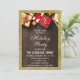 Invitation festive de fête avec une parties scintillant dorée brillante frissonne la bordure, des cadeaux rouges avec des arcs et élégante écriture blanche sur bois brun foncé rustique. C'est une invitation parfaite pour les vacances / Noël / hiver !