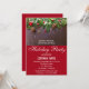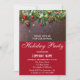 Festive annuel compagnie de vacances de Noël invitation avec branches d'arbres de Noël, cônes de pin et décorations rouge et or sur bois foncé. Les détails de la fête sont écrits en blanc avec un arrière - plan marron rouge vif. Cette invitation rustique à la campagne est parfaite pour des fêtes de vacances, de Noël ou d'hiver !