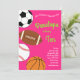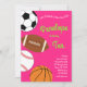 Ces adorables invitations de fête d'anniversaire de sport mignonnes et colorées sont parfaites pour une fête d'anniversaire de thème sportif ! Customisez le texte pour en faire les vôtres. Le look et l'ambiance modernes sont parfaits pour célébrer votre petit qui aime jouer au football, au football, au basket et au football à l'occasion de leur anniversaire ! Parfait en rose pour les filles !