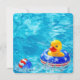 Canard jaune flottant avec un ballon de plage drapeau pour une invitation à une fête au bord de la piscine.