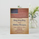 Cartes d'invitation rustiques pour une fête d'adieu pour un militaire avec drapeau américain. Ces invitations de fête avec un drapeau américain rustique sont parfaites pour une fête d'adieu pour un soldat, un départ pour une mission militaire, une célébration de retour à la maison pour un militaire, une remise de diplôme militaire et une retraite militaire. Personnalisez cette invitation avec drapeau américain avec l'événement de votre soldat, son nom et les détails de la fête.