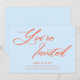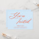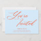 Cette invitation à une fête d'anniversaire comporte « Vous êtes invités » dans un grand script orange arrondi sur un fond bleu ciel doux, avec les détails de la fête en petit texte gras ci-dessous. C'est un look amusant et confiant qui se sent frais et festif. Il y a de la place pour le nom de l'invité d'honneur, l'âge, la date, le lieu et les informations de RSVP. Il est présenté ici comme une invitation pour un 21e anniversaire, mais fonctionne tout aussi bien pour n'importe quel âge - ou honnêtement pour n'importe quelle célébration où vous voulez que l'invitation se sente un peu spéciale.
