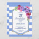 Invitation à une fête d'anniversaire 21 ans avec décor floral rayé bleu.