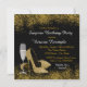 Invitation surprise pour une fête d'anniversaire 50 ans en noir et or avec une élégante flûte à champagne et des chaussures à talons hauts dorées. Vous pouvez facilement personnaliser cette invitation pour une fête d'anniversaire 50 ans en noir et or en ajoutant vos détails avec la police, la couleur et la formulation de votre choix.