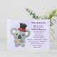 Une invitation à une fête d'anniversaire avec une illustration d'un koala gris mignon mangeant des feuilles d'eucalyptus, portant un haut-de-forme noir élégant avec un ruban rouge. Le fond est une image numérique de lavis de couleurs violettes.
