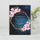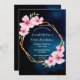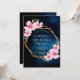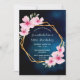 Une invitation à la fête d'anniversaire de 50ème (ou tout âge) à la flore tropicale, aux fleurs d'hibiscus roses, à la verdure et à un cadre géométrique en faux or. Un ciel de nuit bleu foncé comme arrière - plan. Modèles pour un nom écrit avec un script moderne de style manuscrit, modèles pour vos informations de fête. Texte blanc. Parfait pour un été, une piscine ou une fête de plage ! Retour : ciel bleu comme arrière - plan.