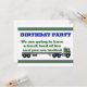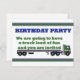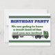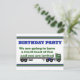 Cette invitation à une fête d'anniversaire est le thème d'un garçon avec une grande plate-forme de cabine et une grande remorque à lit plat en bleu et vert. Les informations sur l'envers sont personnalisables.