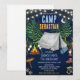 Faites une randonnée jusqu'à une aventure d'anniversaire épique ! Cette invitation d'anniversaire sur le thème du camping présente un ciel nocturne bleu marine magique avec un croissant de lune, des guirlandes lumineuses, des pins imposants, une tente grise classique, un feu de camp crépitant avec des marshmallows grillés, une lanterne, des bottes de randonnée, un sac de couchage, des empreintes de pattes d'ours et un panneau de camping — la scène parfaite pour une célébration en plein air inoubliable.