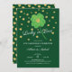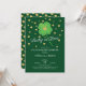 Invitation de fête d'anniversaire moderne et amusante avec un trèfle à quatre feuilles irlandais et des cœurs dorés. Retournez notre invitation de fiançailles chanceuses pour découvrir un dos vert coordonné pour un effet spécial.