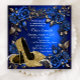 Invitation d'anniversaire bleu royal et or avec de belles chaussures à talons hauts pailletées or et des volutes d'or sur un beau fond floral bleu et or. Cette élégante invitation d'anniversaire bleu et or est facilement personnalisable pour votre événement en ajoutant simplement vos détails dans le style de police et la couleur, la formulation et la mise en page de votre choix.