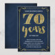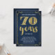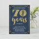 Cette soixante-dixième invitation élégante et élégante de fête d'anniversaire comporte la typographie vintage, les flourishes élégants, la calligraphie de manuscrit de brosse, la feuille d'or de faux, et un arrière - plan chic de bleu marine. Ajoutez les photos ou le texte supplémentaire au dos de la carte si désiré.