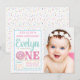 Cartes d'invitation fête d'anniversaire de 1 an avec photo donut et saupoudrage rose et fond saupoudré pour fille. Cette invitation fête d'anniversaire donut est facilement personnalisable pour votre événement en ajoutant votre photo et détails.