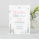 Célébrez votre jour spécial avec cette invitation moderne d'anniversaire de 1 an Winter Onederland ! Ce design présente une scène hivernale avec des flocons de neige pailletés argentés, des arbres, des cerfs et une typographie élégante "Winter ONEderland" dans un thème de couleurs rose, bleu et argent. Invitation parfaite pour une fête d'anniversaire d'hiver pour fille.