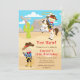 Cette invitation mignonne et amusante présente un cowboy aux cheveux blonds et à la peau claire. Dans une pose, il monte un cheval et lance un lasso et dans l'autre, il a une bobine de corde et il agite. Dans l'arrière - plan est une scène occidentale avec du sable, des montagnes et un cactus. Le texte combine les polices décoratives et sans serif pour un look élégant et moderne. C'est parfait pour un cowboy ou une fête d'anniversaire à thème occidental.