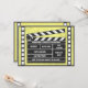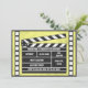 Diffusez la nouvelle d'une soirée sur le thème du cinéma avec cette invitation personnalisée amusante. Une planche à clapet en noir et blanc affiche l'invitation de votre parti à Hollywood et des bandes de films créent des bordures sur les côtés. Contact pour moi couleurs personnalisées.