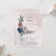 Belle invitation botanique d'anniversaire avec des fleurs rose, blanche et bleu marine avec des feuilles verts sur un cercle vert formant une jolie couronne romantique. POUR PLUS DE PRODUITS CORRESPONDANTS cliquez sur la collection ci-dessus ou contactez-moi.