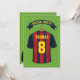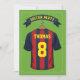 Cartes d'invitation de fête d'anniversaire sur le thème de football avec un fond de terrain de football vert, un maillot de sport rayé burgundy et bleu avec votre nom et numéro, un ballon de football et un modèle de fête moderne.